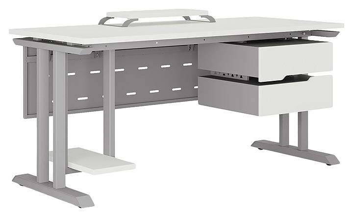 Компьютерный стол Кобор KT-180/70 aluminum/premium используется в офисных помещениях и кабинетах руководителей. Модель оснащена T-образными опорами. Каркас выполнен из металла, выкрашенного в цвет алюминиевый металлик (RAL9006), столешница – из ламинированной древесно-стружечной плиты (ЛДСП) цвета белый премиум (W1000 ST9). Опции (заказываются отдельно):
