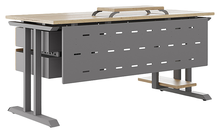 Компьютерный стол Кобор KT-160/60 aluminum/natural используется в офисных помещениях и кабинетах руководителей. Модель оснащена T-образными опорами. Каркас выполнен из металла, выкрашенного в цвет алюминиевый металлик (RAL9006), столешница – из ламинированной древесно-стружечной плиты (ЛДСП) цвета натуральный дуб (H1180 ST37). Опции (заказываются отдельно):