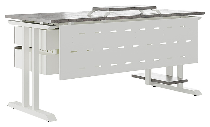Компьютерный стол Кобор КT-120/60 white/chicago используется в офисных помещениях и кабинетах руководителей. Модель оснащена T-образными опорами. Каркас выполнен из металла, выкрашенного в цвет белый муар (RAL9016), столешница – из ламинированной древесно-стружечной плиты (ЛДСП) цвета бетон чикаго (F186 ST9). Опции (заказываются отдельно):