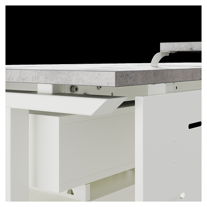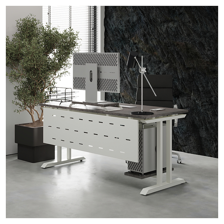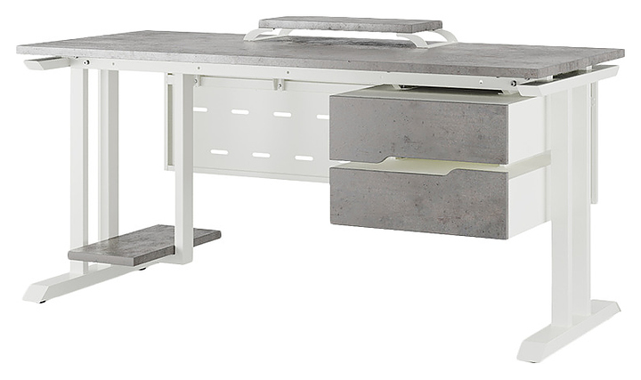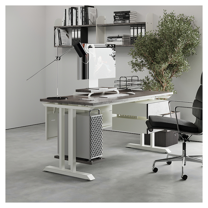 Компьютерный стол Кобор КT-120/70 white/chicago используется в офисных помещениях и кабинетах руководителей. Модель оснащена T-образными опорами. Каркас выполнен из металла, выкрашенного в цвет белый муар (RAL9016), столешница – из ламинированной древесно-стружечной плиты (ЛДСП) цвета бетон чикаго (F186 ST9). Опции (заказываются отдельно):