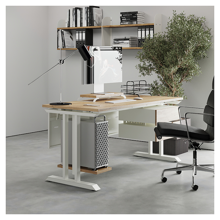 Компьютерный стол Кобор КT-140/60 white/natural используется в офисных помещениях и кабинетах руководителей. Модель оснащена T-образными опорами. Каркас выполнен из металла, выкрашенного в цвет белый муар (RAL9016), столешница – из ламинированной древесно-стружечной плиты (ЛДСП) цвета натуральный дуб (H1180 ST37). Опции (заказываются отдельно):