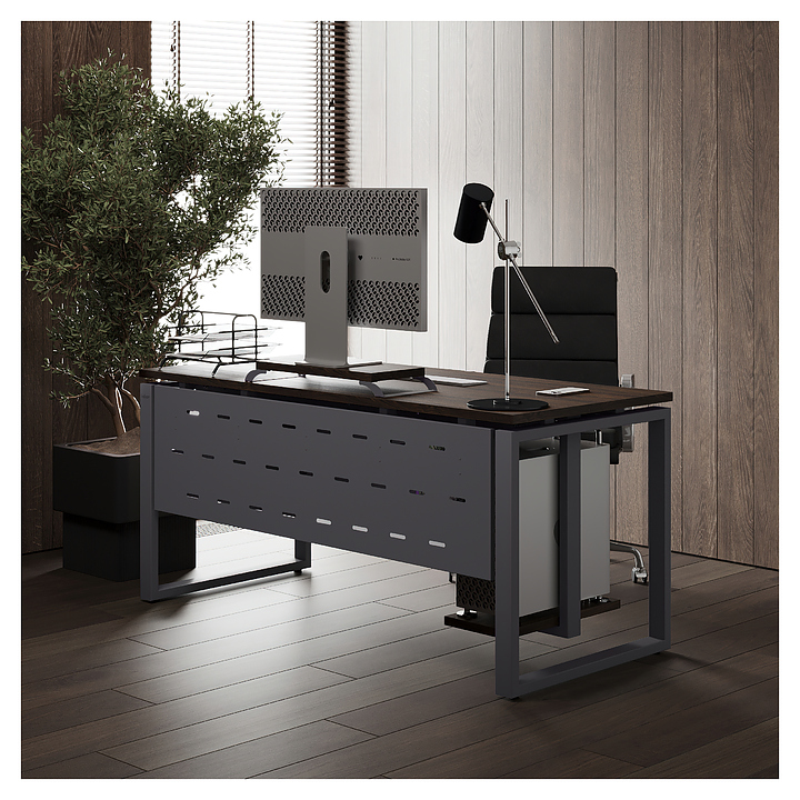 Офисный стол Кобор KO1-180/80 graphite/charlston используется в офисных помещениях и кабинетах руководителей. Модель оснащена O-образными опорами. Каркас выполнен из металла, выкрашенного в цвет графит муар (RAL7024), столешница – из ламинированной древесно-стружечной плиты (ЛДСП) цвета дуб чарльстон (H3154 ST36). Опции (заказываются отдельно):