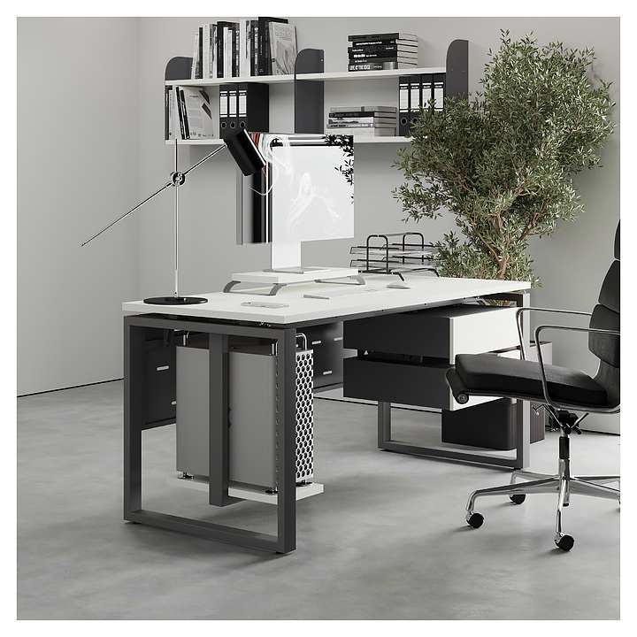 Компьютерный стол Кобор КO1-180/70 aluminum/premium используется в офисных помещениях и кабинетах руководителей. Модель оснащена O-образными опорами. Каркас выполнен из металла, выкрашенного в цвет алюминиевый металлик (RAL9006), столешница – из ламинированной древесно-стружечной плиты (ЛДСП) цвета белый премиум (W1000 ST9). Опции (заказываются отдельно):