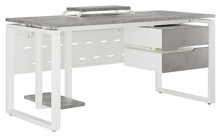 Компьютерный стол Кобор KO1-180/80 white/chicago используется в офисных помещениях и кабинетах руководителей. Модель оснащена O-образными опорами. Каркас выполнен из металла, выкрашенного в цвет белый муар (RAL9016), столешница – из ламинированной древесно-стружечной плиты (ЛДСП) цвета бетон чикаго (F186 ST9). Опции (заказываются отдельно):