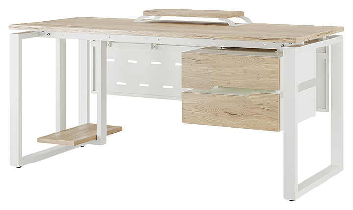 Компьютерный стол Кобор KO1-140/60 white/natural используется в офисных помещениях и кабинетах руководителей. Модель оснащена O-образными опорами. Каркас выполнен из металла, выкрашенного в цвет белый муар (RAL9016), столешница – из ламинированной древесно-стружечной плиты (ЛДСП) цвета натуральный дуб (H1180 ST37). Опции (заказываются отдельно):