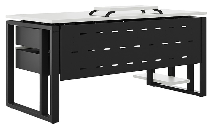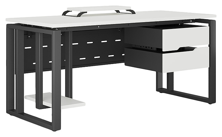 Компьютерный стол Кобор КO2-160/60 black/premium используется в офисных помещениях и кабинетах руководителей. Модель оснащена усиленными вертикальной балкой O-образными опорами. Каркас выполнен из металла, выкрашенного в цвет черный муар (RAL9005), столешница – из ламинированной древесно-стружечной плиты (ЛДСП) цвета белый премиум (W1000 S9). Опции (заказываются отдельно):
