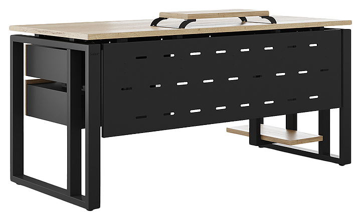 Компьютерный стол Кобор КO2-140/80 black/natural используется в офисных помещениях и кабинетах руководителей. Модель оснащена усиленными вертикальной балкой O-образными опорами. Каркас выполнен из металла, выкрашенного в цвет черный муар (RAL9005), столешница – из ламинированной древесно-стружечной плиты (ЛДСП) цвета натуральный дуб (H1180 ST37). Опции (заказываются отдельно):