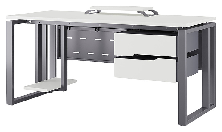 Компьютерный стол Кобор КO2-100/60 graphite/premium используется в офисных помещениях и кабинетах руководителей. Модель оснащена усиленными вертикальной балкой O-образными опорами. Каркас выполнен из металла, выкрашенного в цвет графит муар (RAL7024), столешница – из ламинированной древесно-стружечной плиты (ЛДСП) цвета белый премиум (W1000 ST9). Опции (заказываются отдельно):