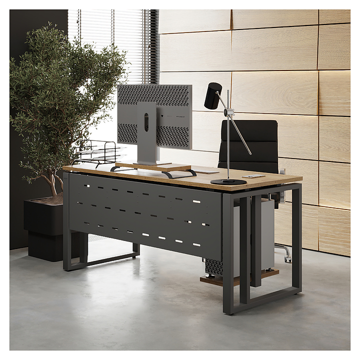 Компьютерный стол Кобор KO2-160/80 aluminum/natural используется в офисных помещениях и кабинетах руководителей. Модель оснащена усиленными вертикальной балкой O-образными опорами. Каркас выполнен из металла, выкрашенного в цвет алюминиевый металлик (RAL9006), столешница – из ламинированной древесно-стружечной плиты (ЛДСП) цвета натуральный дуб (H1180 ST37). Опции (заказываются отдельно):