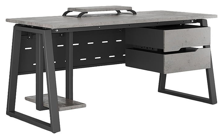 Компьютерный стол Кобор КTR-180/60 black/chicago используется в офисных помещениях и кабинетах руководителей. Модель оснащена опорами в форме трапеции. Каркас выполнен из металла, выкрашенного в цвет черный муар (RAL9005), столешница – из ламинированной древесно-стружечной плиты (ЛДСП) цвета бетон чикаго (F186 ST9). Опции (заказываются отдельно):