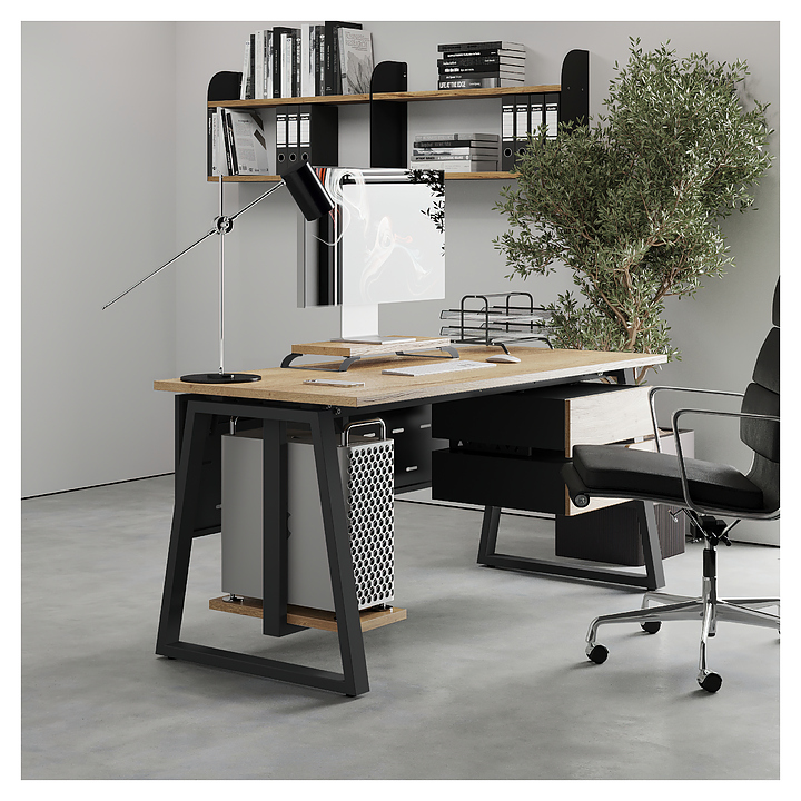 Компьютерный стол Кобор KTR-140/70 black/natural используется в офисных помещениях и кабинетах руководителей. Модель оснащена опорами в форме трапеции. Каркас выполнен из металла, выкрашенного в цвет черный муар (RAL9005), столешница – из ламинированной древесно-стружечной плиты (ЛДСП) цвета натуральный дуб (H1180 ST37). Опции (заказываются отдельно):