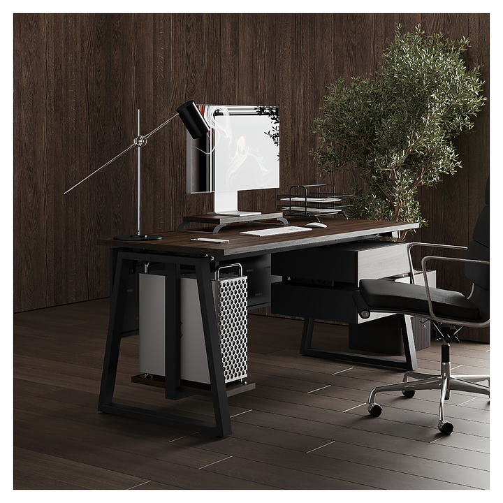 Компьютерный стол Кобор KTR-140/60 black/charlston используется в офисных помещениях и кабинетах руководителей. Модель оснащена опорами в форме трапеции. Каркас выполнен из металла, выкрашенного в цвет черный муар (RAL9005), столешница – из ламинированной древесно-стружечной плиты (ЛДСП) цвета дуб чарльстон (H3154 ST36). Опции (заказываются отдельно):
