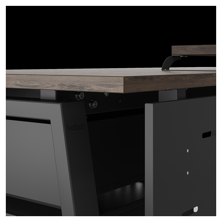 Компьютерный стол Кобор KTR-80/80 black/charlston используется в офисных помещениях и кабинетах руководителей. Модель оснащена опорами в форме трапеции. Каркас выполнен из металла, выкрашенного в цвет черный муар (RAL9005), столешница – из ламинированной древесно-стружечной плиты (ЛДСП) цвета дуб чарльстон (H3154 ST36). Опции (заказываются отдельно):