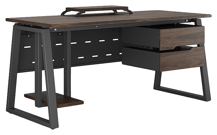 Компьютерный стол Кобор KTR-120/80 black/charlston используется в офисных помещениях и кабинетах руководителей. Модель оснащена опорами в форме трапеции. Каркас выполнен из металла, выкрашенного в цвет черный муар (RAL9005), столешница – из ламинированной древесно-стружечной плиты (ЛДСП) цвета дуб чарльстон (H3154 ST36). Опции (заказываются отдельно):