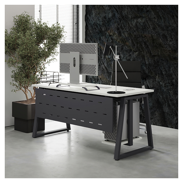 Офисный стол Кобор TR-160/70 graphite/premium используется в офисных помещениях и кабинетах руководителей. Модель оснащена опорами в форме трапеции. Каркас выполнен из металла, выкрашенного в цвет графит муар (RAL7024), столешница – из ламинированной древесно-стружечной плиты (ЛДСП) цвета белый премиум (W1000 ST9). Опции (заказываются отдельно):