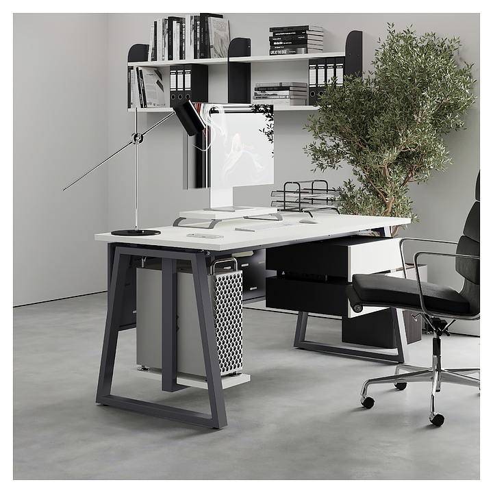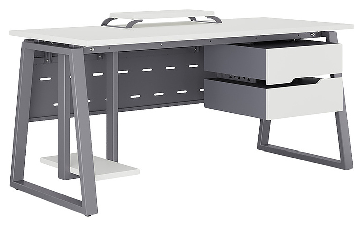 Компьютерный стол Кобор КTR-100/80 graphite/premium используется в офисных помещениях и кабинетах руководителей. Модель оснащена опорами в форме трапеции. Каркас выполнен из металла, выкрашенного в цвет графит муар (RAL7024), столешница – из ламинированной древесно-стружечной плиты (ЛДСП) цвета белый премиум (W1000 ST9). Опции (заказываются отдельно):