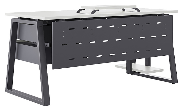 Компьютерный стол Кобор КTR-180/80 graphite/premium используется в офисных помещениях и кабинетах руководителей. Модель оснащена опорами в форме трапеции. Каркас выполнен из металла, выкрашенного в цвет графит муар (RAL7024), столешница – из ламинированной древесно-стружечной плиты (ЛДСП) цвета белый премиум (W1000 ST9). Опции (заказываются отдельно):