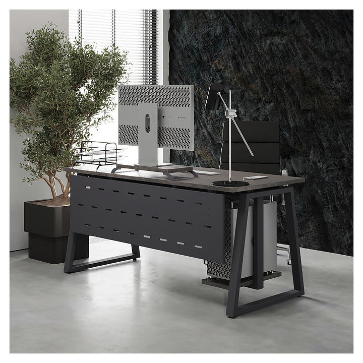 Компьютерный стол Кобор КTR-80/80 graphite/chicago используется в офисных помещениях и кабинетах руководителей. Модель оснащена опорами в форме трапеции. Каркас выполнен из металла, выкрашенного в цвет графит муар (RAL7024), столешница – из ламинированной древесно-стружечной плиты (ЛДСП) цвета бетон чикаго (F186 ST9). Опции (заказываются отдельно):