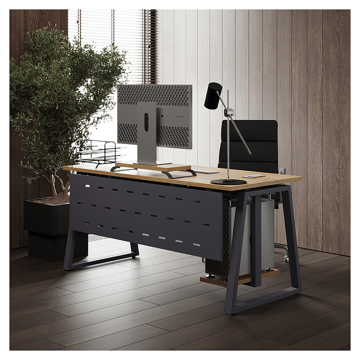Компьютерный стол Кобор КTR-180/80 graphite/natural используется в офисных помещениях и кабинетах руководителей. Модель оснащена опорами в форме трапеции. Каркас выполнен из металла, выкрашенного в цвет графит муар (RAL7024), столешница – из ламинированной древесно-стружечной плиты (ЛДСП) цвета натуральный дуб (H1180 ST37). Опции (заказываются отдельно):