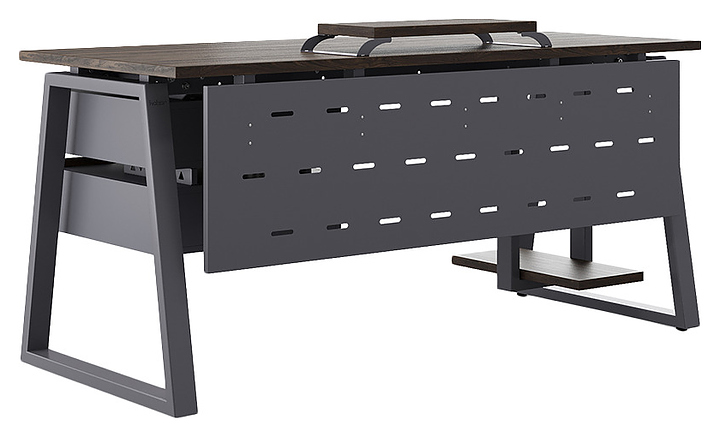 Компьютерный стол Кобор КTR-120/70 graphite/charlston используется в офисных помещениях и кабинетах руководителей. Модель оснащена опорами в форме трапеции. Каркас выполнен из металла, выкрашенного в цвет графит муар (RAL7024), столешница – из ламинированной древесно-стружечной плиты (ЛДСП) цвета дуб чарльстон (H3154 ST36). Опции (заказываются отдельно):