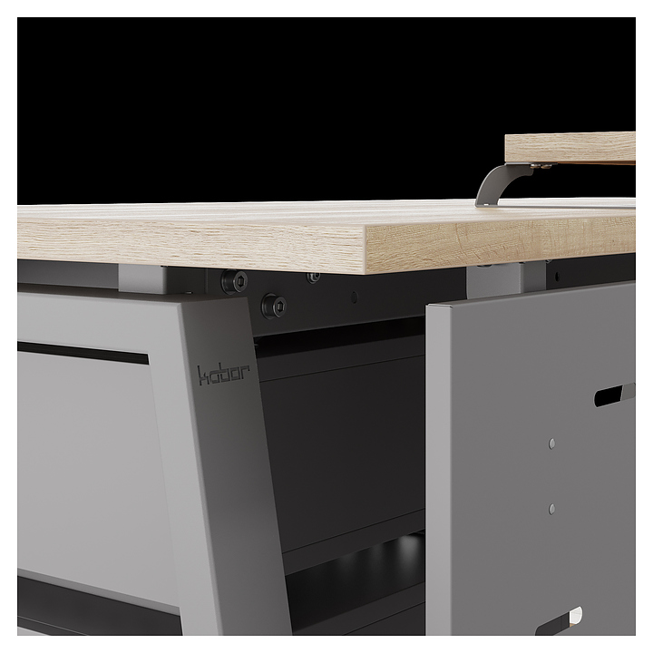 Компьютерный стол Кобор KTR-80/80 aluminum/natural используется в офисных помещениях и кабинетах руководителей. Модель оснащена опорами в форме трапеции. Каркас выполнен из металла, выкрашенного в цвет алюминиевый металлик (RAL9006), столешница – из ламинированной древесно-стружечной плиты (ЛДСП) цвета натуральный дуб (H1180 ST37). Опции (заказываются отдельно):