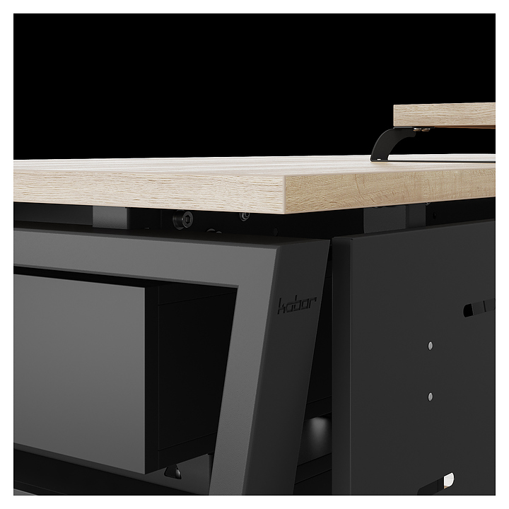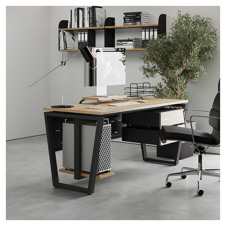 Компьютерный стол Кобор КOTR-140/60 black/natural используется в офисных помещениях и кабинетах руководителей. Модель оснащена опорами в форме обратной трапеции. Каркас выполнен из металла, выкрашенного в цвет черный муар (RAL9005), столешница – из ламинированной древесно-стружечной плиты (ЛДСП) цвета натуральный дуб (H1180 ST37). Опции (заказываются отдельно):