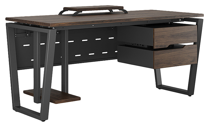 Компьютерный стол Кобор КOTR-80/80 black/charlston используется в офисных помещениях и кабинетах руководителей. Модель оснащена опорами в форме обратной трапеции. Каркас выполнен из металла, выкрашенного в цвет черный муар (RAL9005), столешница – из ламинированной древесно-стружечной плиты (ЛДСП) цвета дуб чарльстон (H3154 ST36). Опции (заказываются отдельно):