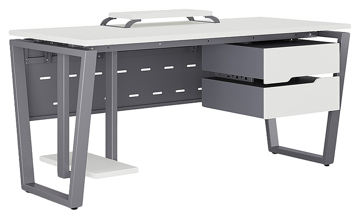 Офисный стол Кобор OTR-120/70 graphite/premium используется в офисных помещениях и кабинетах руководителей. Модель оснащена опорами в форме обратной трапеции. Каркас выполнен из металла, выкрашенного в цвет графит муар (RAL7024), столешница – из ламинированной древесно-стружечной плиты (ЛДСП) цвета белый премиум (W1000 ST9). Опции (заказываются отдельно):