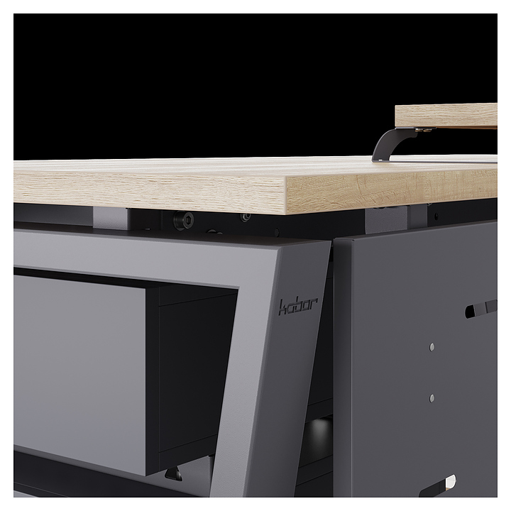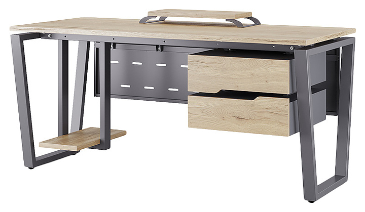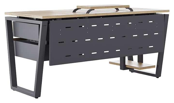 Компьютерный стол Кобор КOTR-160/70 graphite/natural используется в офисных помещениях и кабинетах руководителей. Модель оснащена опорами в форме обратной трапеции. Каркас выполнен из металла, выкрашенного в цвет графит муар (RAL7024), столешница – из ламинированной древесно-стружечной плиты (ЛДСП) цвета натуральный дуб (H1180 ST37). Опции (заказываются отдельно):