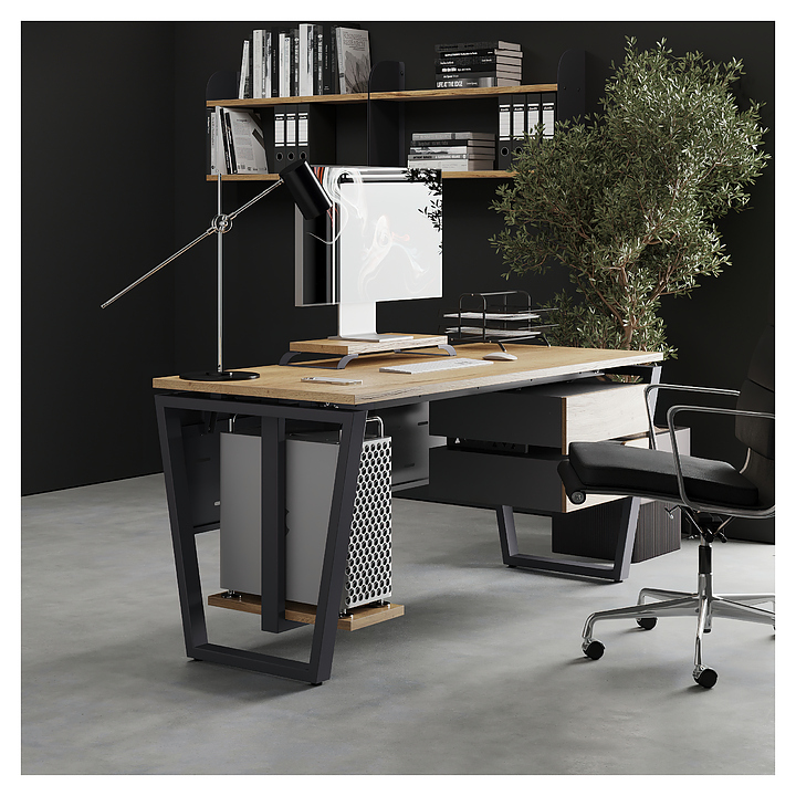 Компьютерный стол Кобор КOTR-180/70 graphite/natural используется в офисных помещениях и кабинетах руководителей. Модель оснащена опорами в форме обратной трапеции. Каркас выполнен из металла, выкрашенного в цвет графит муар (RAL7024), столешница – из ламинированной древесно-стружечной плиты (ЛДСП) цвета натуральный дуб (H1180 ST37). Опции (заказываются отдельно):
