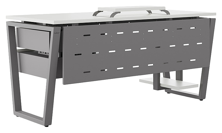 Компьютерный стол Кобор KOTR-140/70 aluminum/premium используется в офисных помещениях и кабинетах руководителей. Модель оснащена опорами в форме обратной трапеции. Каркас выполнен из металла, выкрашенного в цвет алюминиевый металлик (RAL9006), столешница – из ламинированной древесно-стружечной плиты (ЛДСП) цвета белый премиум (W1000 ST9). Опции (заказываются отдельно):