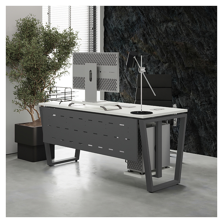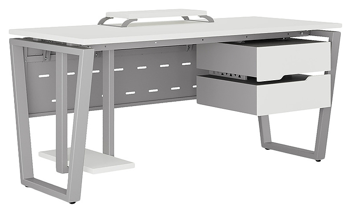 Компьютерный стол Кобор KOTR-100/80 aluminum/premium используется в офисных помещениях и кабинетах руководителей. Модель оснащена опорами в форме обратной трапеции. Каркас выполнен из металла, выкрашенного в цвет алюминиевый металлик (RAL9006), столешница – из ламинированной древесно-стружечной плиты (ЛДСП) цвета белый премиум (W1000 ST9). Опции (заказываются отдельно):