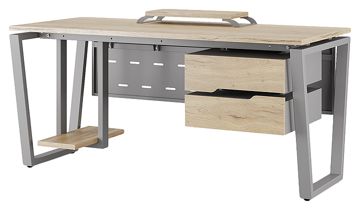 Компьютерный стол Кобор KOTR-100/60 aluminum/natural используется в офисных помещениях и кабинетах руководителей. Модель оснащена опорами в форме обратной трапеции. Каркас выполнен из металла, выкрашенного в цвет алюминиевый металлик (RAL9006), столешница – из ламинированной древесно-стружечной плиты (ЛДСП) цвета натуральный дуб (H1180 ST37). Опции (заказываются отдельно):