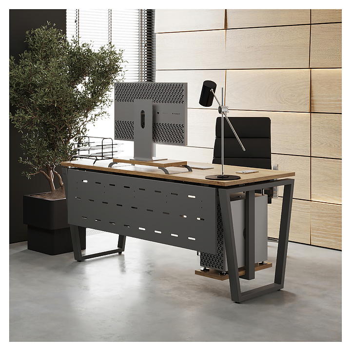 Компьютерный стол Кобор КOTR-100/70 aluminum/natural используется в офисных помещениях и кабинетах руководителей. Модель оснащена опорами в форме обратной трапеции. Каркас выполнен из металла, выкрашенного в цвет алюминиевый металлик (RAL9006), столешница – из ламинированной древесно-стружечной плиты (ЛДСП) цвета натуральный дуб (H1180 ST37). Опции (заказываются отдельно):