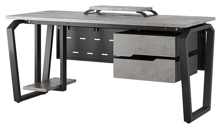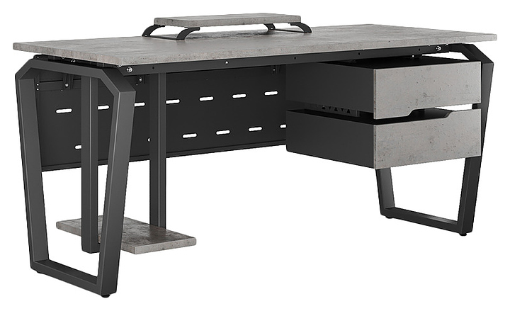 Компьютерный стол Кобор КTB-80/80 black/chicago используется в офисных помещениях и кабинетах руководителей. Модель оснащена опорами в форме обратной трапеции со скошенными верхними углами. Каркас выполнен из металла, выкрашенного в цвет черный муар (RAL9005), столешница – из ламинированной древесно-стружечной плиты (ЛДСП) цвета бетон чикаго (F186 ST9). Опции (заказываются отдельно):
