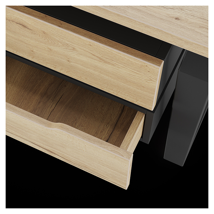 Компьютерный стол Кобор KTB-140/70 black/natural используется в офисных помещениях и кабинетах руководителей. Модель оснащена опорами в форме обратной трапеции со скошенными верхними углами. Каркас выполнен из металла, выкрашенного в цвет черный муар (RAL9005), столешница – из ламинированной древесно-стружечной плиты (ЛДСП) цвета натуральный дуб (H1180 ST37). Опции (заказываются отдельно):