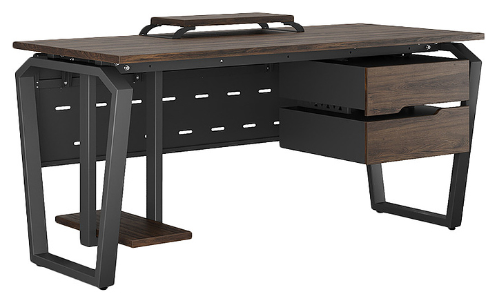Компьютерный стол Кобор KTB-120/70 black/charlston используется в офисных помещениях и кабинетах руководителей. Модель оснащена опорами в форме обратной трапеции со скошенными верхними углами. Каркас выполнен из металла, выкрашенного в цвет черный муар (RAL9005), столешница – из ламинированной древесно-стружечной плиты (ЛДСП) цвета дуб чарльстон (H3154 ST36). Опции (заказываются отдельно):