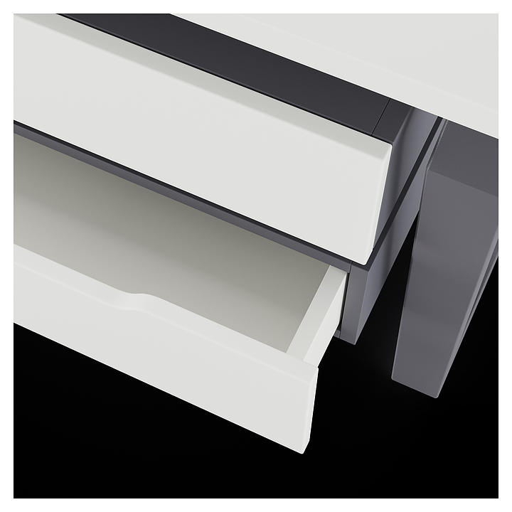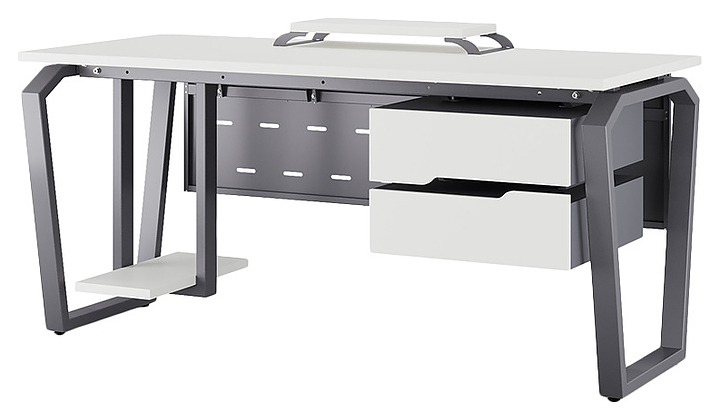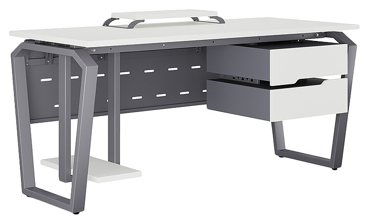 Компьютерный стол Кобор KTB-180/60 graphite/premium используется в офисных помещениях и кабинетах руководителей. Модель оснащена опорами в форме обратной трапеции со скошенными верхними углами. Каркас выполнен из металла, выкрашенного в цвет графит муар (RAL7024), столешница – из ламинированной древесно-стружечной плиты (ЛДСП) цвета белый премиум (W1000 ST9). Опции (заказываются отдельно):