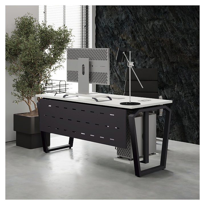 Компьютерный стол Кобор KTB-80/80 graphite/premium используется в офисных помещениях и кабинетах руководителей. Модель оснащена опорами в форме обратной трапеции со скошенными верхними углами. Каркас выполнен из металла, выкрашенного в цвет графит муар (RAL7024), столешница – из ламинированной древесно-стружечной плиты (ЛДСП) цвета белый премиум (W1000 ST9). Опции (заказываются отдельно):