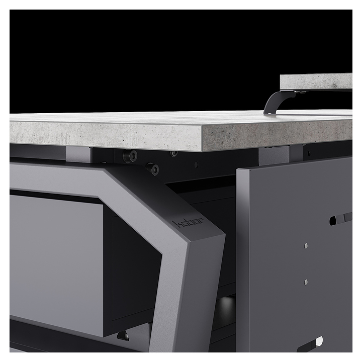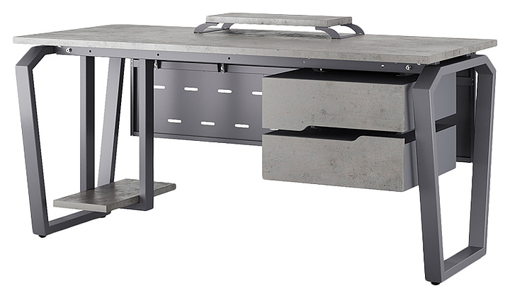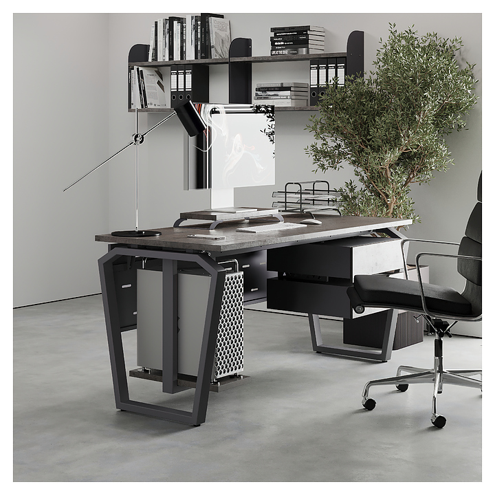 Компьютерный стол Кобор KTB-120/70 graphite/chicago используется в офисных помещениях и кабинетах руководителей. Модель оснащена опорами в форме обратной трапеции со скошенными верхними углами. Каркас выполнен из металла, выкрашенного в цвет графит муар (RAL7024), столешница – из ламинированной древесно-стружечной плиты (ЛДСП) цвета бетон чикаго (F186 ST9). Опции (заказываются отдельно):