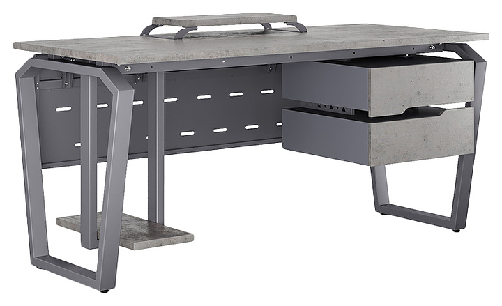 Kомпьютерный стол Кобор КTB-160/70 graphite/chicago используется в офисных помещениях и кабинетах руководителей. Модель оснащена опорами в форме обратной трапеции со скошенными верхними углами. Каркас выполнен из металла, выкрашенного в цвет графит муар (RAL7024), столешница – из ламинированной древесно-стружечной плиты (ЛДСП) цвета бетон чикаго (F186 ST9). Опции (заказываются отдельно):