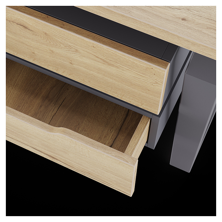 Компьютерный стол Кобор KTB-180/60 graphite/natural используется в офисных помещениях и кабинетах руководителей. Модель оснащена опорами в форме обратной трапеции со скошенными верхними углами. Каркас выполнен из металла, выкрашенного в цвет графит муар (RAL7024), столешница – из ламинированной древесно-стружечной плиты (ЛДСП) цвета натуральный дуб (H1180 ST37). Опции (заказываются отдельно):