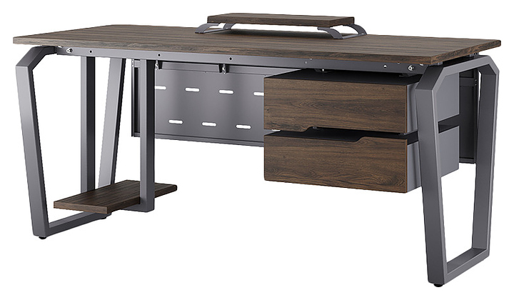 Компьютерный стол Кобор КTB-160/60 graphite/charlston используется в офисных помещениях и кабинетах руководителей. Модель оснащена опорами в форме обратной трапеции со скошенными верхними углами. Каркас выполнен из металла, выкрашенного в цвет графит муар (RAL7024), столешница – из ламинированной древесно-стружечной плиты (ЛДСП) цвета дуб чарльстон (H3154 ST36). Опции (заказываются отдельно):