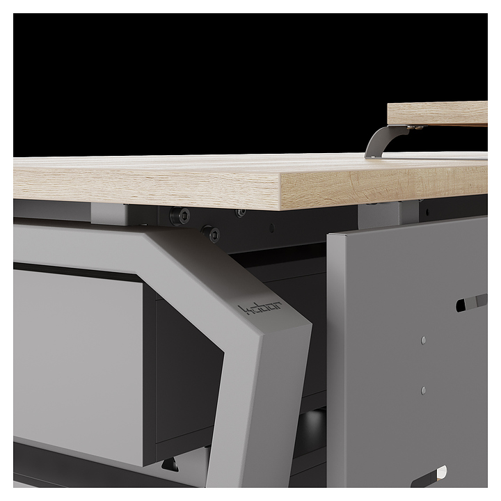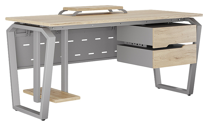 Компьютерный стол Кобор КTB-120/60 aluminum/natural используется в офисных помещениях и кабинетах руководителей. Модель оснащена опорами в форме обратной трапеции со скошенными верхними углами. Каркас выполнен из металла, выкрашенного в цвет алюминиевый металлик (RAL9006), столешница – из ламинированной древесно-стружечной плиты (ЛДСП) цвета натуральный дуб (H1180 ST37). Опции (заказываются отдельно):
