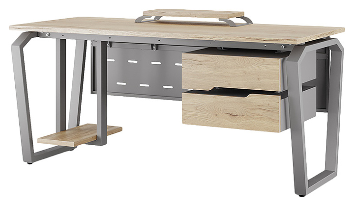 Компьютерный стол Кобор КTB-120/70 aluminum/natural используется в офисных помещениях и кабинетах руководителей. Модель оснащена опорами в форме обратной трапеции со скошенными верхними углами. Каркас выполнен из металла, выкрашенного в цвет алюминиевый металлик (RAL9006), столешница – из ламинированной древесно-стружечной плиты (ЛДСП) цвета натуральный дуб (H1180 ST37). Опции (заказываются отдельно):