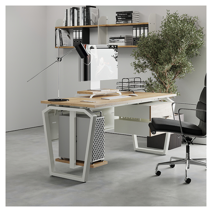 Компьютерный стол Кобор KTB-140/70 white/natural используется в офисных помещениях и кабинетах руководителей. Модель оснащена опорами в форме обратной трапеции со скошенными верхними углами. Каркас выполнен из металла, выкрашенного в цвет белый муар (RAL9016), столешница – из ламинированной древесно-стружечной плиты (ЛДСП) цвета натуральный дуб (H1180 ST37). Опции (заказываются отдельно):