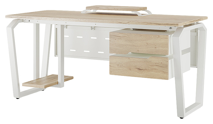 Компьютерный стол Кобор KTB-160/80 white/natural используется в офисных помещениях и кабинетах руководителей. Модель оснащена опорами в форме обратной трапеции со скошенными верхними углами. Каркас выполнен из металла, выкрашенного в цвет белый муар (RAL9016), столешница – из ламинированной древесно-стружечной плиты (ЛДСП) цвета натуральный дуб (H1180 ST37). Опции (заказываются отдельно):