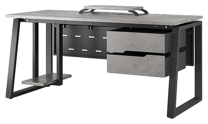Компьютерный стол Кобор KTS1-80/80 black/chicago используется в офисных помещениях и кабинетах руководителей. Модель оснащена опорами в форме наклонной трапеции. Каркас выполнен из металла, выкрашенного в цвет черный муар (RAL9005), столешница – из ламинированной древесно-стружечной плиты (ЛДСП) цвета бетон чикаго (F186 ST9). Опции (заказываются отдельно):
