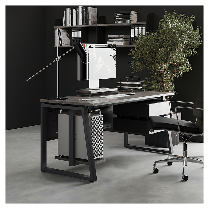 Компьютерный стол Кобор KTS1-120/80 black/chicago используется в офисных помещениях и кабинетах руководителей. Модель оснащена опорами в форме наклонной трапеции. Каркас выполнен из металла, выкрашенного в цвет черный муар (RAL9005), столешница – из ламинированной древесно-стружечной плиты (ЛДСП) цвета бетон чикаго (F186 ST9). Опции (заказываются отдельно):