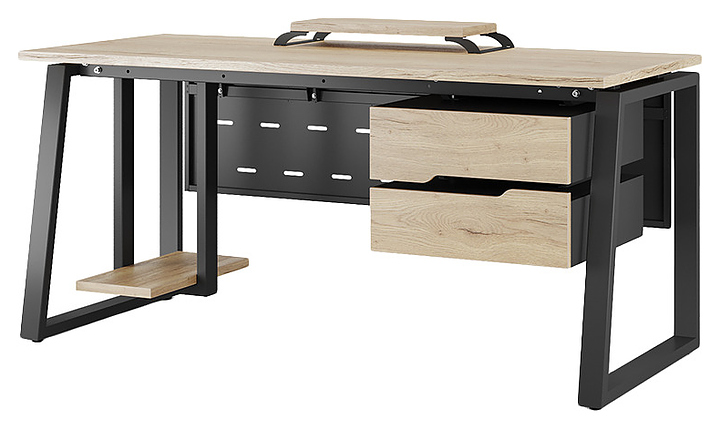 Компьютерный стол Кобор KTS1-160/80 black/natural используется в офисных помещениях и кабинетах руководителей. Модель оснащена опорами в форме наклонной трапеции. Каркас выполнен из металла, выкрашенного в цвет черный муар (RAL9005), столешница – из ламинированной древесно-стружечной плиты (ЛДСП) цвета натуральный дуб (H1180 ST37). Опции (заказываются отдельно):